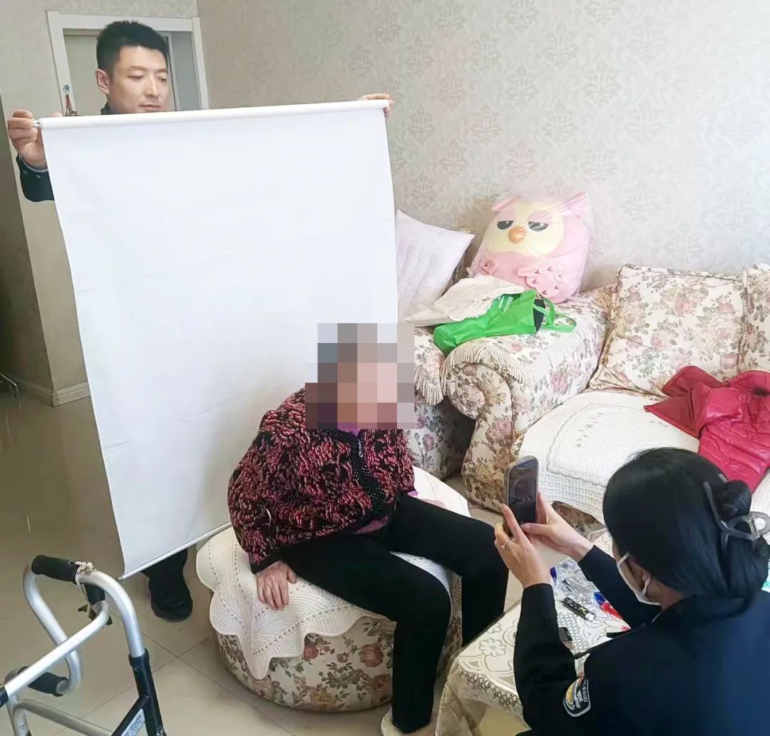 11月9日,锦华派出所户籍民警与社区民警携带相机、幕布等身份证采集设备到82岁高龄的孙大娘家里帮助其办理身份证件,民警用提前准备好的幕布“搭建”人体背景墙的样子,让孙大娘家属感动不已。