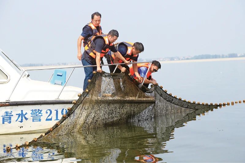 长江十年禁渔计划从2020年1月1日0时起开始实施。江西省共青城公安局启动“长江流域非法捕捞首轮同步巡查执法行动”,严厉打击非法捕捞违法犯罪行为。图为2020年8月25日,共青城公安局民警对新发现的非法捕捞“迷魂阵”进行处理。 公安部供图