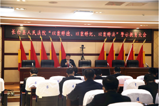 会上政治部主任杨录钢同志宣读了《长白朝鲜族自治县人民法院关于开展“以案释德、以案释纪、以案释法”警示教育活动实施方案》。通报了吉林省法院系统干警违法违纪典型案例,警示全院干警以此为鉴,切实加强思想认识,在工作中要保持清醒头脑,常怀警醒之心,常思腐败之害,始终做到司法公正、踏实做事、廉洁办案。