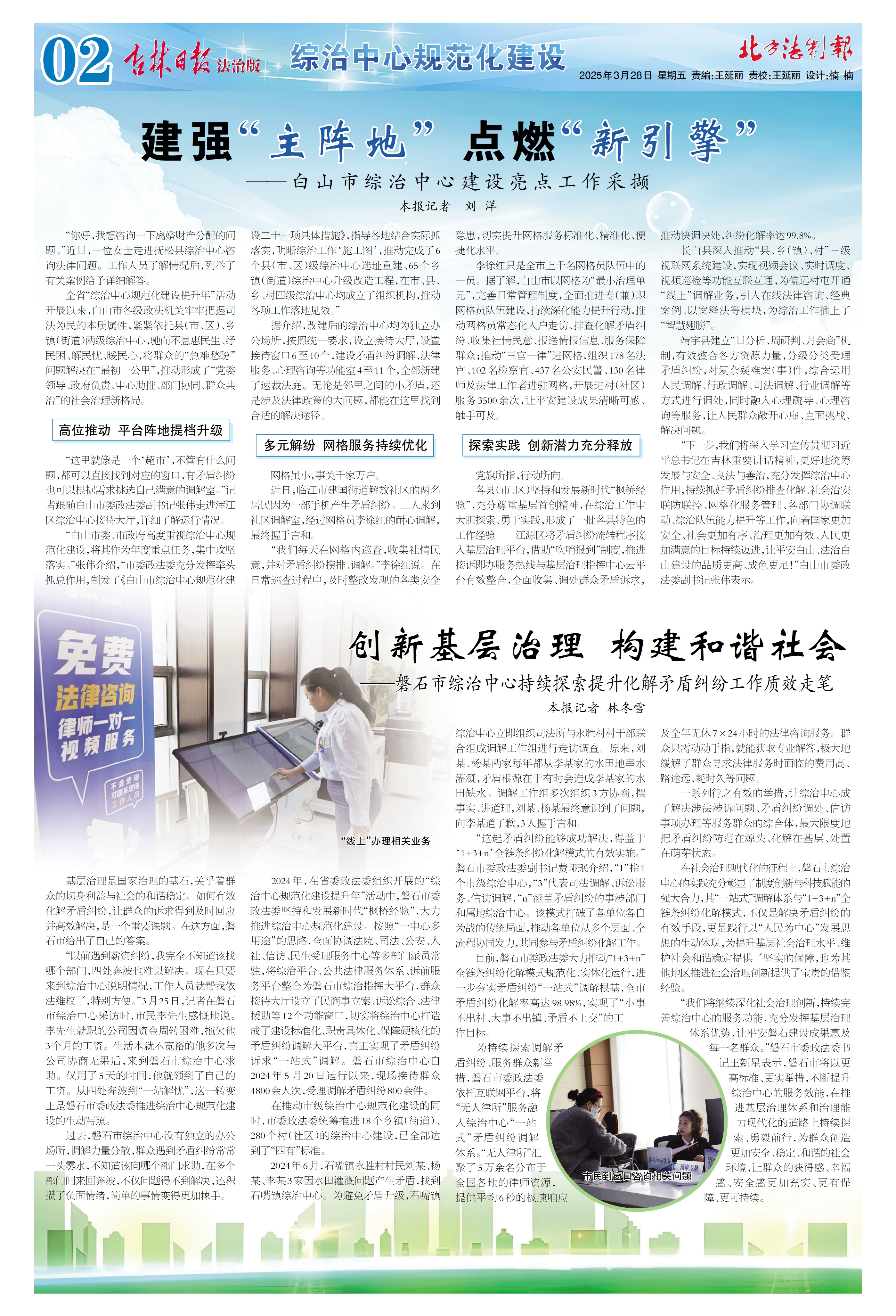 各县(市、区)坚持和发展新时代“枫桥经验”,充分尊重基层首创精神,在综治工作中大胆探索、勇于实践,形成了一批各具特色的工作经验——江源区将矛盾纠纷流转程序接入基层治理平台,借助“吹哨报到”制度,推进接诉即办服务热线与基层治理指挥中心云平台有效整合,全面收集、调处群众矛盾诉求,推动快调快处,纠纷化解率达99.8%。 长白县深入推动“县、乡(镇)、村”三级视联网系统建设,实现视频会议、实时调度、视频巡检等功能互联互通,为偏远村屯开通“线上”调解业务,引入在线法律咨询、经典案例、以案释法等模块,为综治工作插上了“智慧翅膀”。 靖宇县建立“日分析、周研判、月会商”机制,有效整合各方资源力量,分级分类受理矛盾纠纷,对复杂疑难案(事)件,综合运用人民调解、行政调解、司法调解、行业调解等方式进行调处,同时融入心理疏导、心理咨询等服务,让人民群众敞开心扉、直面挑战、解决问题。 “下一步,我们将深入学习宣传贯彻习近平总书记在吉林重要讲话精神,更好地统筹发展与安全、良法与善治,充分发挥综治中心作用,持续抓好矛盾纠纷排查化解、社会治安联防联控、网格化服务管理、各部门协调联动、综治队伍能力提升等工作,向着国家更加安全、社会更加有序、治理更加有效、人民更加满意的目标持续迈进,让平安白山、法治白山建设的品质更高、成色更足!”白山市委政法委副书记张伟表示。