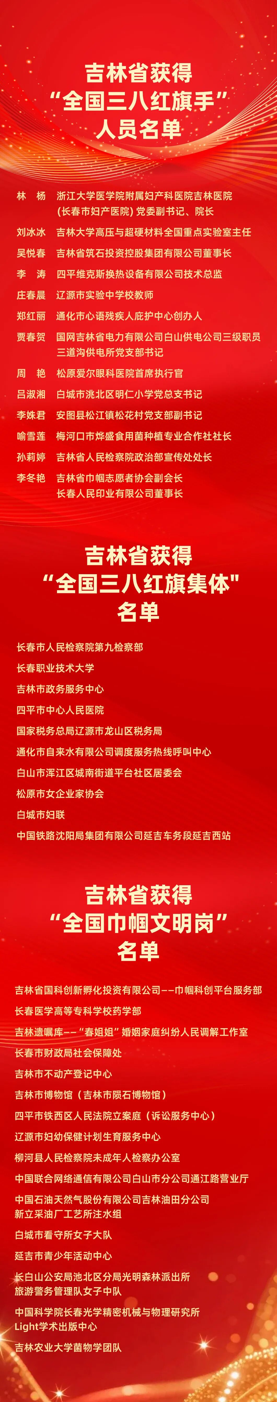 今天(3月2日),全国妇联在京举行纪念“三八”国际妇女节暨表彰大会,并公布2025年度全国三八红旗手标兵、全国三八红旗手、全国三八红旗集体及全国巾帼文明岗名单。其中,吉林省13人获评“全国三八红旗手”,10个集体获评“全国三八红旗集体”,16个集体获评“全国巾帼文明岗名单”。