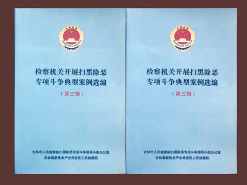 为深入贯彻落实高检院党组关于扫黑除恶专项斗争要坚持法治思维,确保专项斗争始终在法治轨道上运行的要求,吉林高新区人民检察院以高检院及“两高”“两部”文件为指导内容,由党组书记牵头安排部署,经党组成员多次研究确定内容和版式,精心汇编,印制成《检察机关开展扫黑除恶专项斗争典型案例选编(第三辑)》一书。
