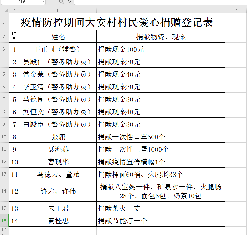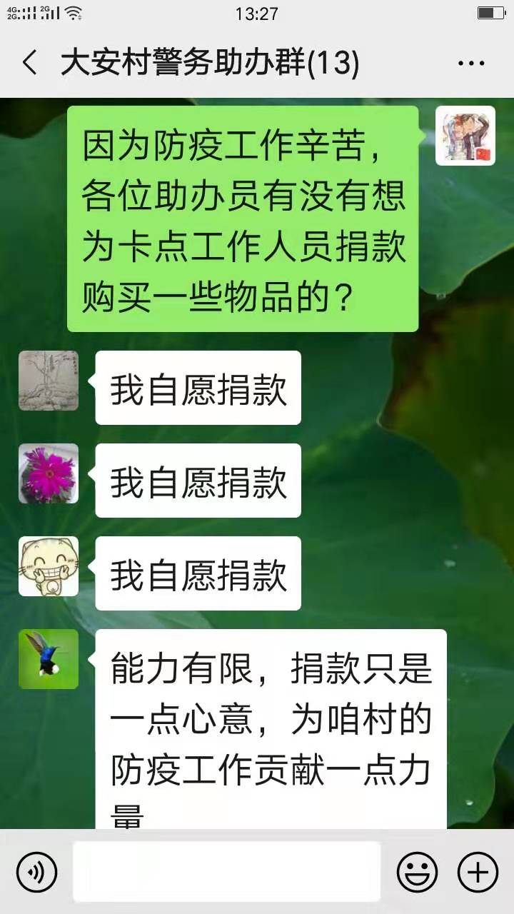 “虽然我们拿不了太多的钱,但是在抗击肺炎疫情的关键时候,我们作为助办员,要带头为疫情防控贡献绵薄之力,与大家齐心协力打贏疫情防控阻击战。”大安村6名助办员商量后,一起以捐款方式,表达自己的一份心意。