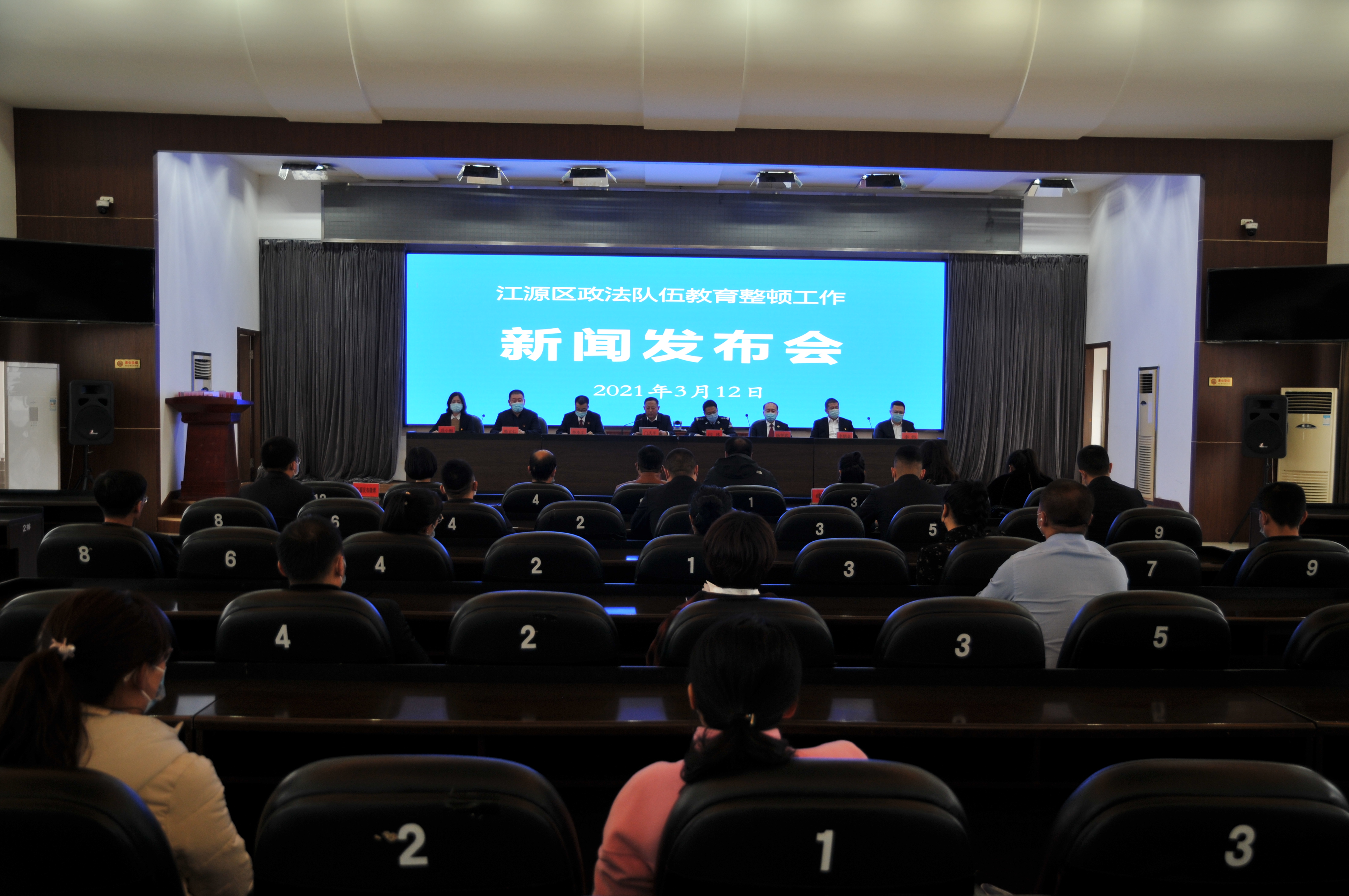 3月12日,江源区政法队伍教育整顿新闻发布会在区政府九楼会议室召开。区委常委、政法委书记门庆军主持发布会。