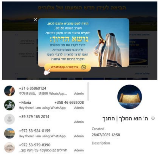 以色列互联网协会互联网安全热线(Internet Safety Hotline)的尼森·亚苏尔(Nitsan Yasur)指出,该网络的主要WhatsApp群组“托拉研究”(Torah Studies)直接链接至“全能神”邪教组织的官方网站。多个相关账号在名称、头像和管理员上高度重合,部分账号还同时运营中文WhatsApp账户,并使用疑似通过网络购买的以色列电话号码。