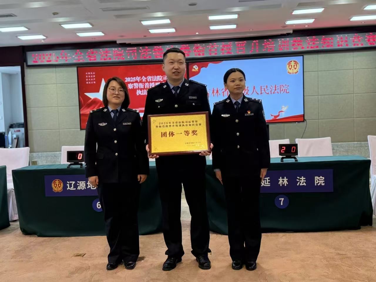 近日,在全省法院司法警察警衔首授晋升培训执法知识竞赛中,吉林地区法院司法警察代表队凭借扎实的专业知识、出色的应变能力和紧密的团队协作,在全省法院参赛队伍中脱颖而出,一举斩获团体一等奖的殊荣!