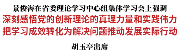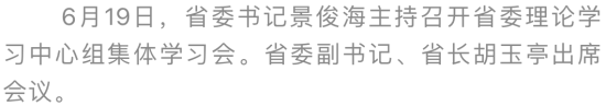 6月19日,省委书记景俊海主持召开省委理论学习中心组集体学习会,深入学习贯彻习近平总书记关于主题教育的系列重要讲话和重要指示批示精神。景俊海强调,要坚持以习近平新时代中国特色社会主义思想为指引,深刻感悟党的创新理论的真理力量和实践伟力,切实把学习成效转化为解决问题、推动发展的实际行动。省委副书记、省长胡玉亭出席会议。