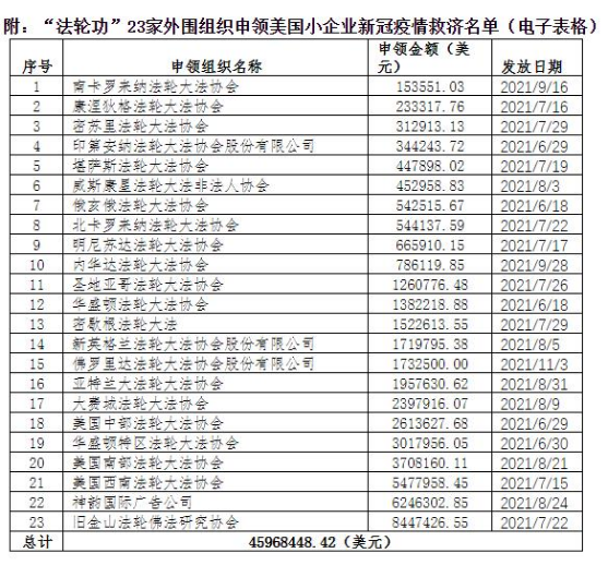 据美国小企业管理局网站公布新冠疫情期间“关闭场馆运营商救济金”申领名单,截至2022年7月5日,23个替“神韵演出”敛取钱财的美国“法轮功”外围组织,共计套现美国政府新冠疫情救济金高达近4600万美元(约合人民币3.12亿元),超过法定限额近3600万美元。