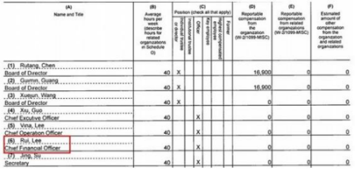 年审报告显示,其财务总监为李洪志的妻子李瑞(Rui Lee)