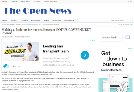 2020年10月1日,澳大利亚“透明新闻网”(Openthenews.com)登载专栏作家麦迪逊·布朗(Maddison Brown)文章指出,“法轮功”旗下“解码中国”(“法轮功”外围组织)通过澳洲反华智库组织“澳大利亚战略政策研究所”获得美国国务院扶持资金。