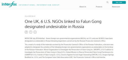 据俄罗斯国际文传电讯社2020年7月20日消息,经俄罗斯检察长办公室研究确定,“法轮功”邪教所属七个在俄非政府组织(NGO),其中六个属美国组织和一个属英国组织,被指定为俄罗斯不受欢迎的组织。