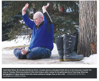 这名男子是谁?为何抢夺枪械行凶杀人?根据警方调查,该男子名叫瑞陶尔(Daniel Peter Rintoul),时年38岁,居住在温哥华,先前来自阿尔伯塔省。2000年,瑞陶尔痴迷上“法轮功”,并于2002年伙同他人到天安门广场参与邪教闹事活动,后被捕并遭遣返。瑞陶尔曾接受《卡尔加里先锋报》(Calgary Herald)访问,谈及他如何修炼“法轮功”等。