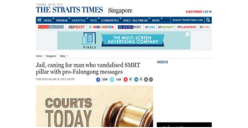 2014年8月21日,一位名叫高兵(音译)的中国公民用黑色记号笔在沿新加坡一地铁高架立柱上用中文书写“法轮功”邪教口号,猖狂的高兵在书写完后还留下手机号码,而新加坡地铁公司为修复此立柱污迹花费了300美金。一周后,高兵又在新加坡陆路交通管理部门一个信号控制箱上书写“法轮功”邪教用语。此事发生后,高兵因被判处两个月监禁及六记鞭刑。