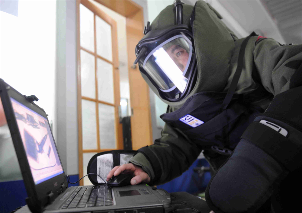 “干扰仪能屏蔽疑似爆炸物的信号,为准确判断疑似爆炸物的类型及炸药成分,还需使用炸药探测仪……”一名身穿军绿色与黑色相间排爆服的特警,在一一做完上述检查后,趴在地上,右手握着一把特制不导电的剪子,“咔嚓”一声,剪断了疑似爆炸物的蓝色电线, 疑似爆炸物被成功排除……