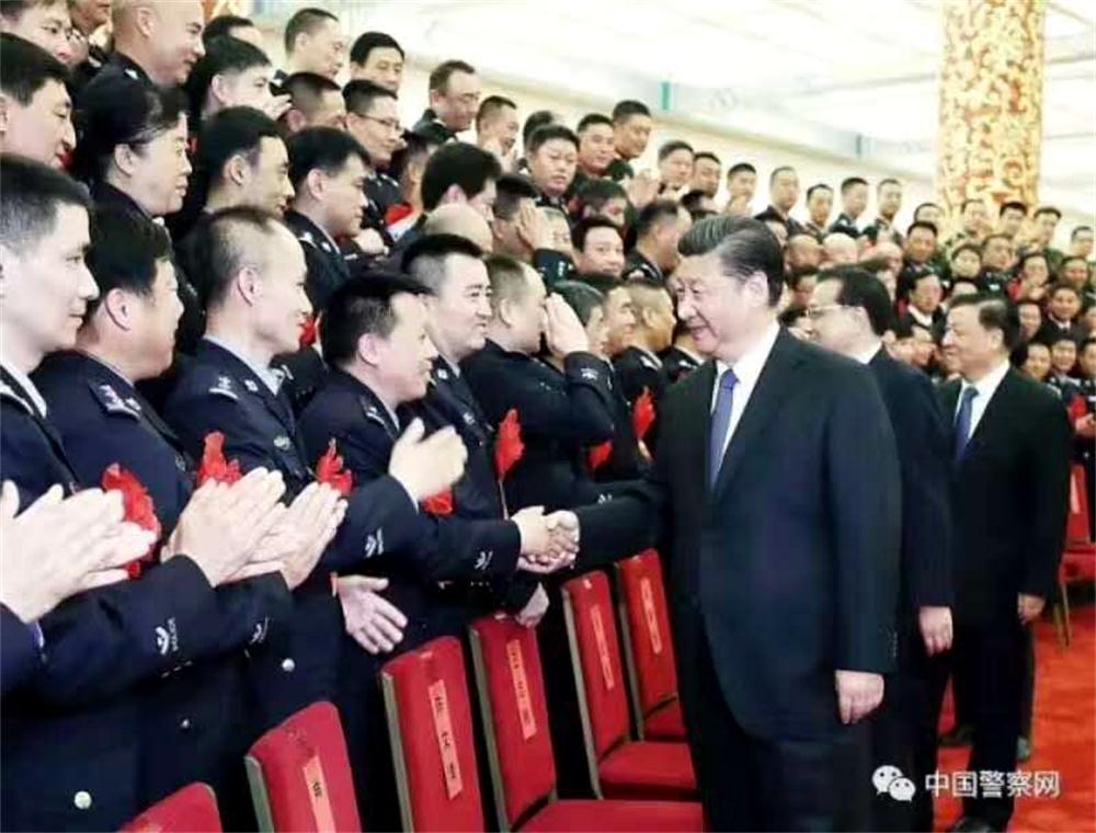 2017年5月19日,习近平总书记会见全国公安系统英雄模范立功集体表彰大会代表。朱建民(前排左三)。