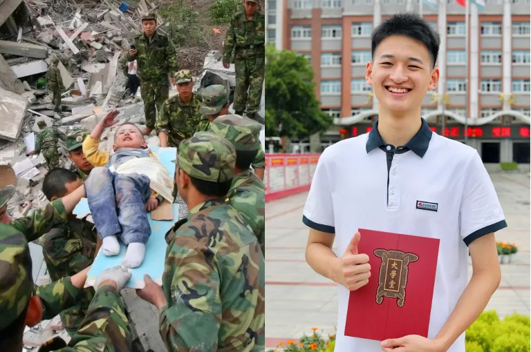 左图为2008年5月13日,汶川地震后,郎铮被救出。右图为2023年7月24日,郎铮收到北京大学国际关系学院录取通知书。
