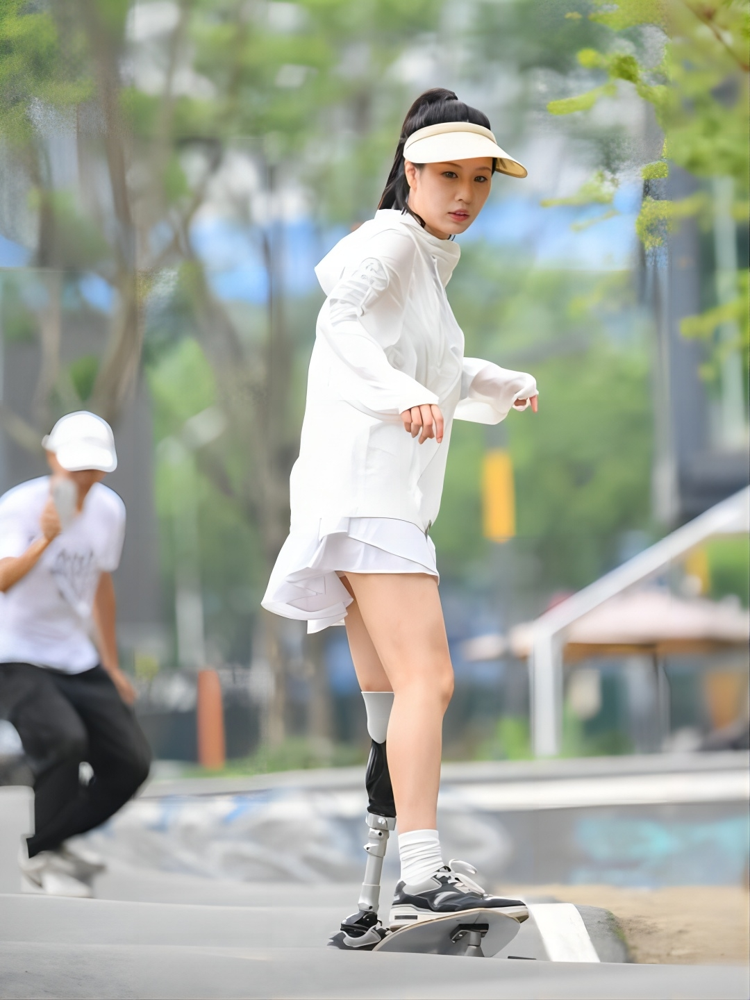 上图为胡月2008年汶川地震后在帐篷医院。下图为2023年6月20日,胡月在成都市锦江区轻极限运动公园练习滑板。