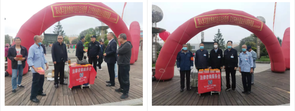 蛟河市法学会于9月17日在蛟河市人民广场举办 “为民办实事、送法到基层”大型活动。市委常委、政法委书记、法学会会长郝玉智,市委政法委常务副书记、法学会常务副会长徐宝林参加了活动并讲话。受法学会邀请律师、法律工作者现场回答群众所提出的相关法律问题;蛟河市法学会现场印制了“掌上问法”APP二维码,供现场群众下载;蛟河市长安街社区五名三贤人士及法学会工作人员发放民法典宣传手册1万余份,宣传兜子1000个。为了扩大影响面,蛟河市法学会还邀请了新区秧歌队前来助阵,活跃了活动现场的气氛。