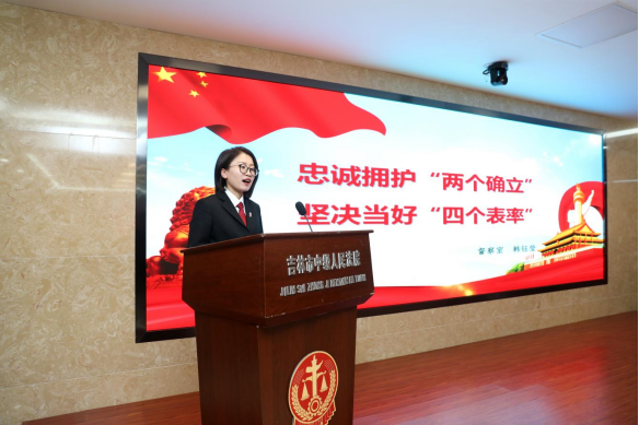分享者韩钰莹以《忠诚拥护“两个确立” 坚决当好“四个表率”》为题,围绕“坚定不移全面从严治党,深入推进新时代党的建设伟大工程”,向全院青年干警发出“筑牢忠诚之魂,做政治过硬的表率;扛起担当之责,做干事创业的表率;恪守为民之心,做践行宗旨的表率;保持敬畏之心,做清正廉洁的表率。”的号召。