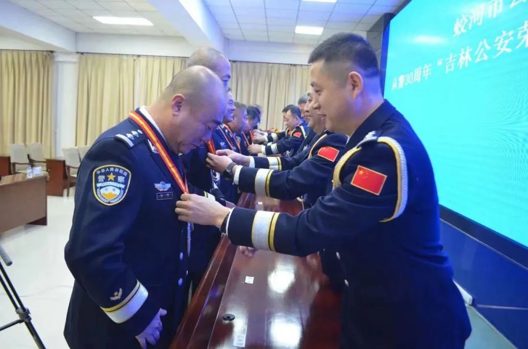 为进一步增强民警的职业荣誉感和归属感,提升队伍的凝聚力、战斗力,见证警魂传承,蛟河市公安局举行了从警三十年荣誉勋章颁发仪式,局领导为从警30年民警颁发了“吉林公安荣誉勋章”。并期望他们在今后的工作中,继续传承和发扬好人民警察的光荣传统和优良作风,以强烈的责任意识和担当意识,切实担负起维护社会稳定、保障人民安宁的神圣使命。副市长、公安局长任峰在仪式上讲话指出,1月10日是属于我们自己的节日,是全国200万人民警察共同的节日,祝同志们节日快乐!