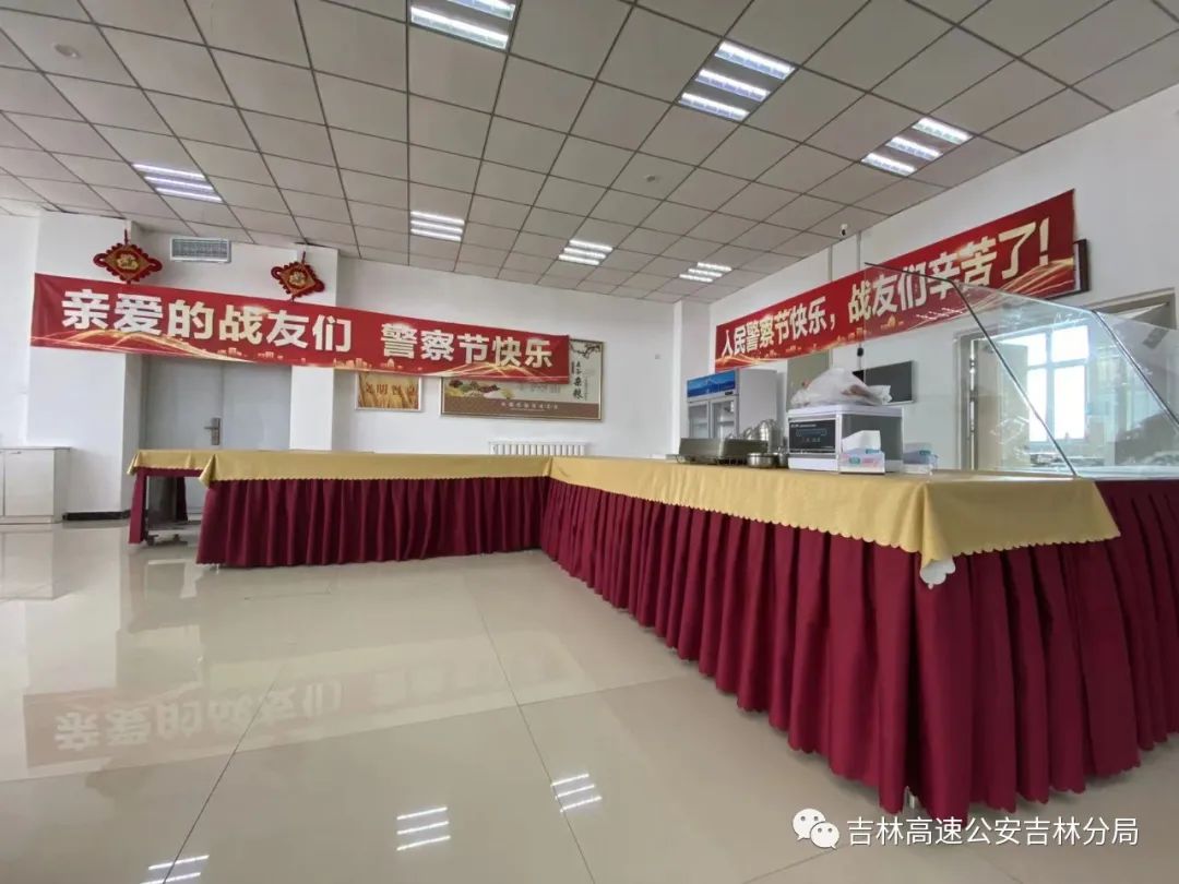 分局悬挂庆祝条幅,营造浓烈节日氛围。同时食堂提高节日菜品质量,做好民警后勤保障工作。