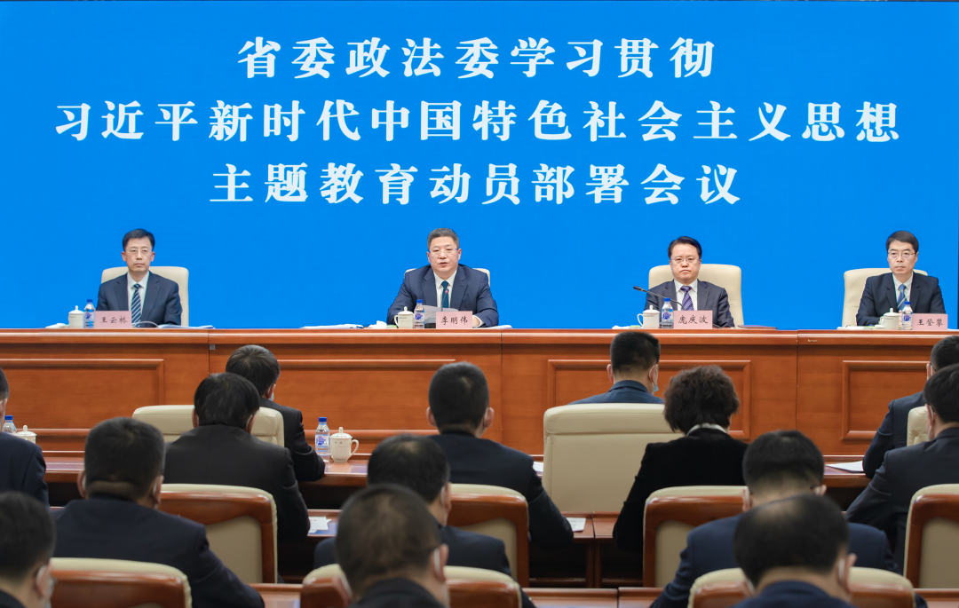 4月11日,省委政法委学习贯彻习近平新时代中国特色社会主义思想主题教育动员部署会议召开,深入贯彻习近平总书记在学习贯彻习近平新时代中国特色社会主义思想主题教育工作会议上的重要讲话精神,全面落实省委部署要求,迅速行动起来,感悟思想伟力,全面掀起开展主题教育热潮,奋力推进新时代新征程吉林政法工作高质量发展,为推动吉林全面振兴取得新突破贡献政法力量。省委常委、省委政法委书记李明伟主持会议并作动员讲话,省委第4巡回指导组组长庞庆波到会指导并讲话。