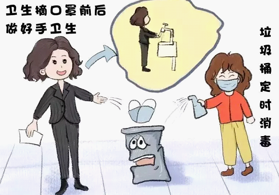 防疫期间,摘口罩前后做好手卫生,废弃口罩放入垃圾桶内,每天两次使用75%酒精或含氯消毒剂对垃圾桶进行消毒处理。