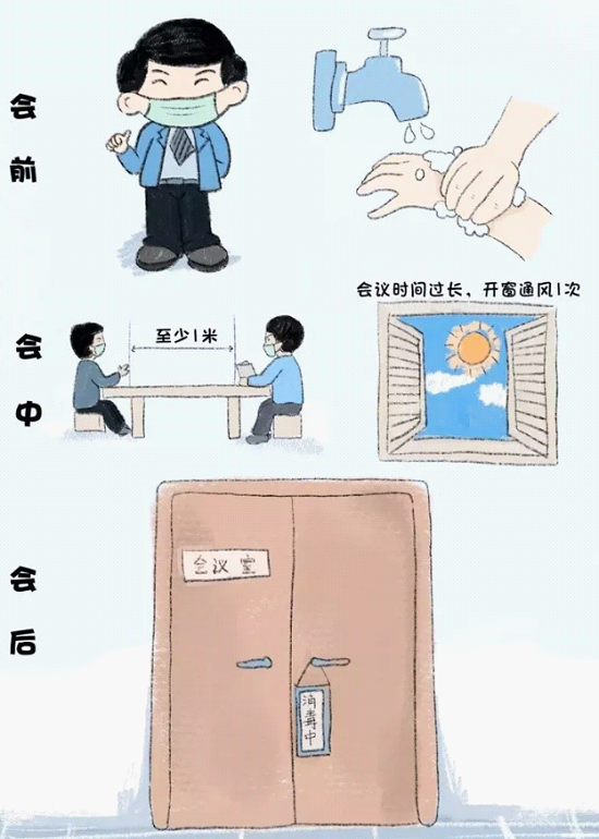建议全程佩戴口罩,进入会议室前所有人员先洗手。开会人员间距1米以上。可以线上开会尽量避免线下会议,注意控制会议时间,会议时间过长时,注意开窗通风。会议结束后对场地、家具须进行消毒,茶具用品等建议使用一次性产品或开水浸泡消毒。
