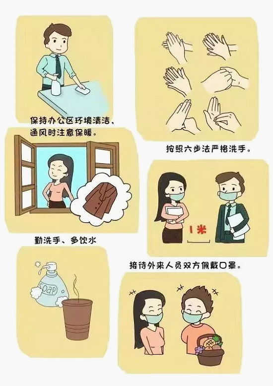 保持办公区域环境清洁,建议每日通风3次,20-30分钟每次,通风时注意保暖。人与人之间保持1米以上距离,多人办公时佩戴口罩。保持勤洗手、多饮水,坚持在进食前、如厕后按照七步洗手法严格洗手。如有接待外来人员双方须全程佩戴口罩。