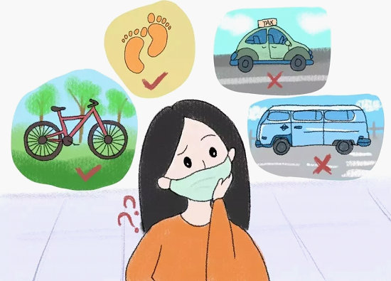建议步行、骑行或乘坐私家车、班车上班,尽量不要乘坐公共交通工具。如必须乘坐公共交通工具时,请务必全程佩戴口罩。途中尽量避免用手触摸车上物品。