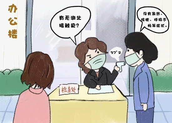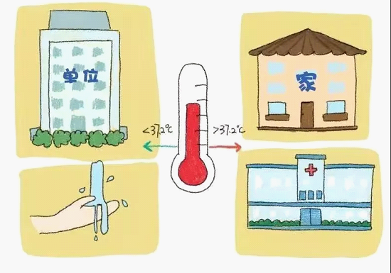 进入办公楼前自觉接受体温检测,如体温正常可入楼工作。开始工作前先去卫生间洗手。若体温超过37.2℃,请勿逗留,回家休息,自我观察,必要时到医院就诊。