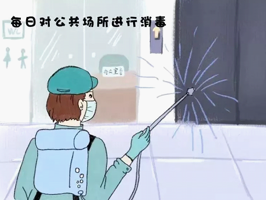 每日须对门厅、楼道、会议室、电梯、楼梯、卫生间等公共部位进行消毒,尽量使用喷雾消毒。每个区域使用的保洁用具要分开,避免混用。