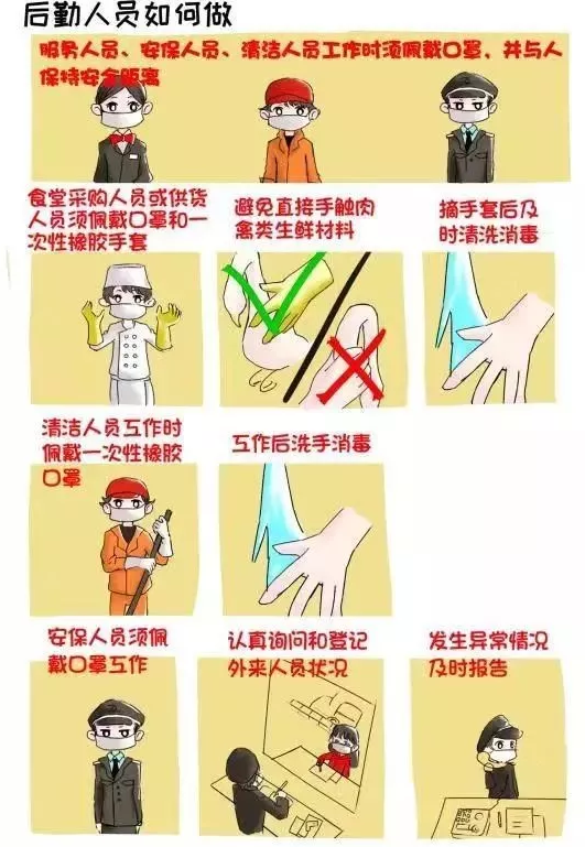 服务人员、安保人员、清洁人员工作时须佩戴口罩,并与人保持安全距离。食堂采购人员或供货人员须佩戴口罩和一次性橡胶手套,避免直接手触肉禽类生鲜材料,摘手套后及时洗手消毒。保洁人员工作时须佩戴一次性橡胶手套,工作结束后洗手消毒。安保人员须佩戴口罩工作,并认真询问和登记外来人员状况,发现异常情况及时报告。