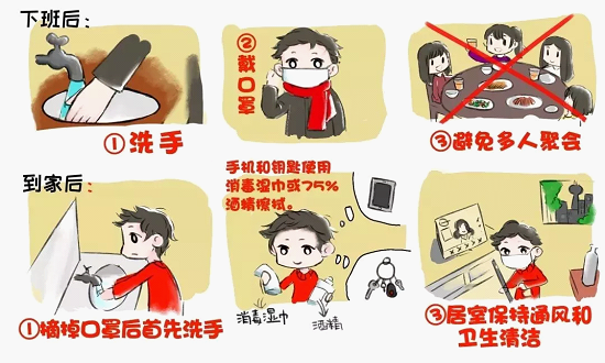 下班后先洗手,再戴上口罩外出。回到家中摘掉口罩后首先洗手消毒,手机和钥匙使用消毒湿巾或75%酒精擦拭。居室保持通风和清洁卫生,避免多人聚会。