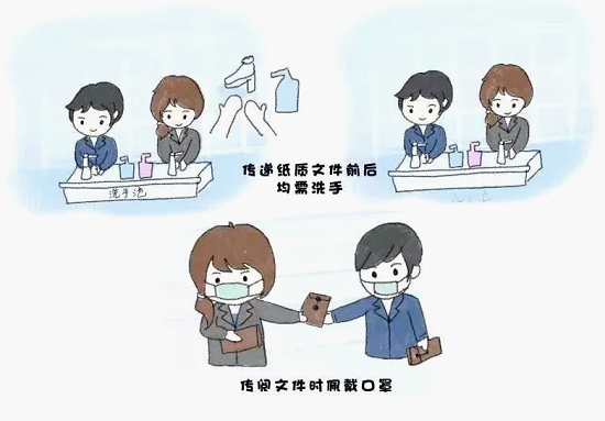 传递纸质文件前后均需洗手,传阅文件时佩戴口罩。