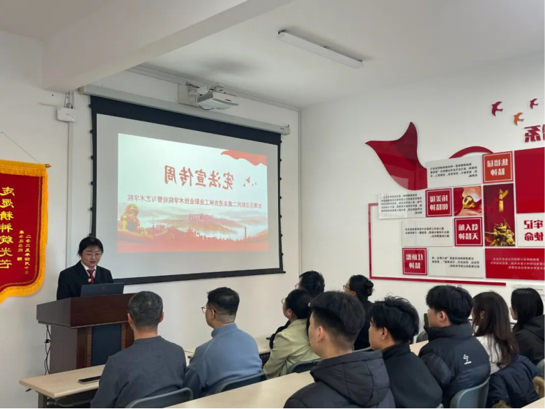 活动现场,民二庭法官张昕宇结合宣传对象特点,精准搭建普法桥梁。生动讲解了宪法的起源、我国宪法的核心内容及宪法日的设立意义,通过典型案例剖析、互动问答等形式,让抽象的法律条文变得通俗易懂。同时,张昕宇法官聚焦宪法赋予的职责使命,解读了宪法在国家治理、依法行政中的根本遵循作用,结合职务行为规范、政务公开等相关法律法规,引导师生树立“依宪履职、依法办事”的工作理念,活动中,法官们还耐心解答了师生提出的法律疑问,现场氛围热烈,得到了广泛好评。