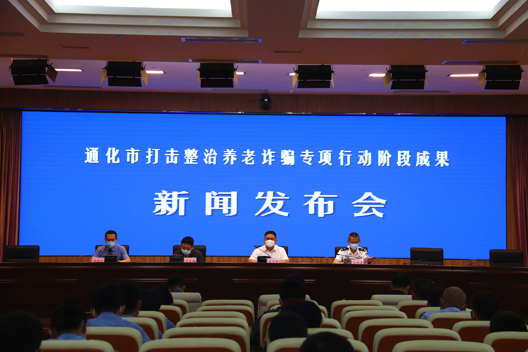 8月19日下午,通化市召开打击整治养老诈骗专项行动阶段成果新闻发布会。市委政法委副书记李学峰介绍全市打击整治养老诈骗专项行动整体情况;市公安局党组成员、副局长尤传进、市中级人民法院党组成员、副院长刘东海和市人民检察院党组成员、政治部主任孟祥东分别介绍专项行动阶段性成果。