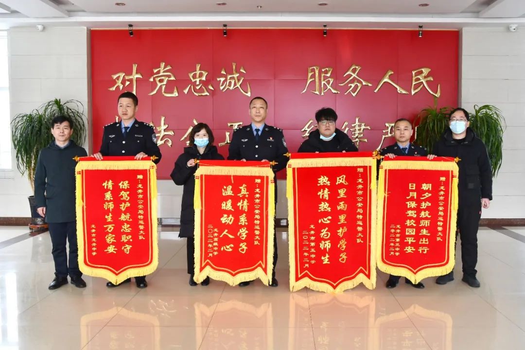 当天,龙井高级中学、龙井中学、龙井三中、龙井五中4所学校的负责人来到龙井市公安局,向无论严寒酷暑都始终坚守在学校周边的特巡警民警送来了感谢锦旗,感谢他们为维护学校师生的安全所付出的艰辛和汗水。